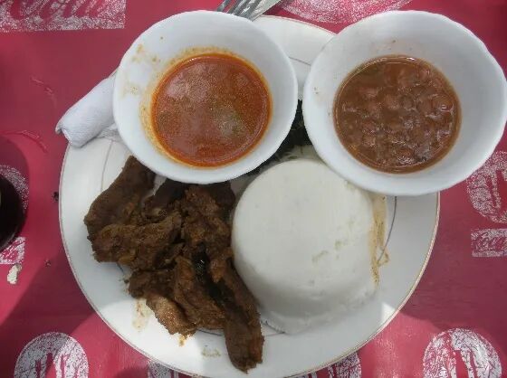 Fufu搭配浓稠的汤才能发挥口感优势。在非洲,配菜主料通常包括鱼或肉,以及番茄、秋葵、菠菜等熟后质地软烂的蔬菜,并以辣椒调味。此外,也有棕榈仁汤、花生汤等作为汤品。