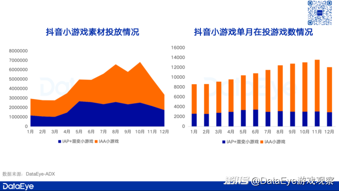 DataEye研究院发布的《2025年度小游戏买量数据报告》显示,抖音小游戏从1月至11月,在投游戏数累计增幅达75.4%,市场需求红利持续释放;素材投放数方面,抖音小游戏全年投放量持续走高,尤其7-10月爆发式增长。
