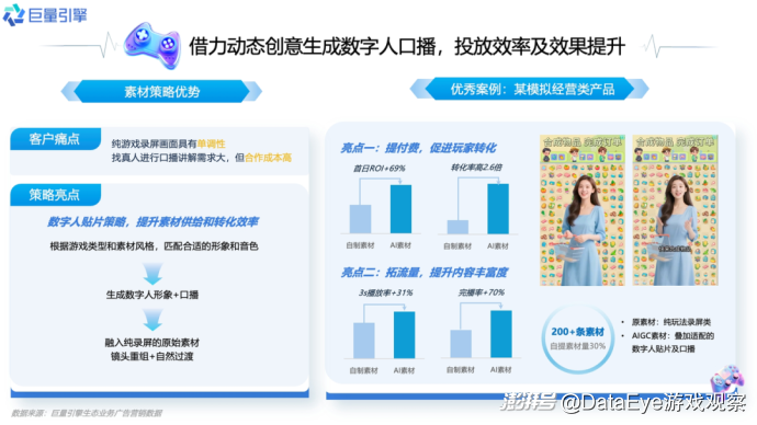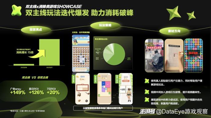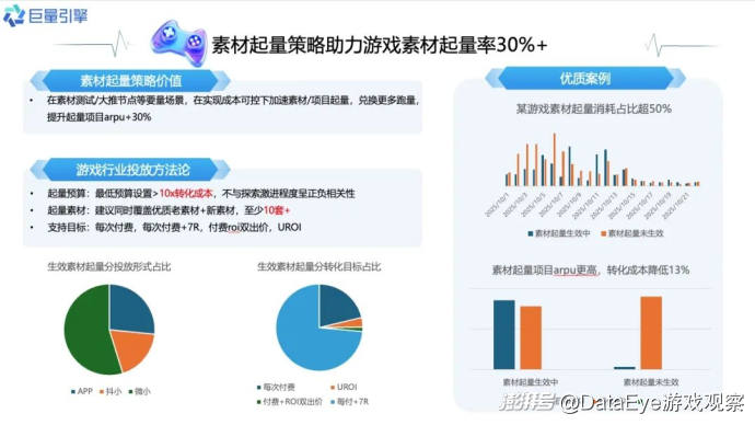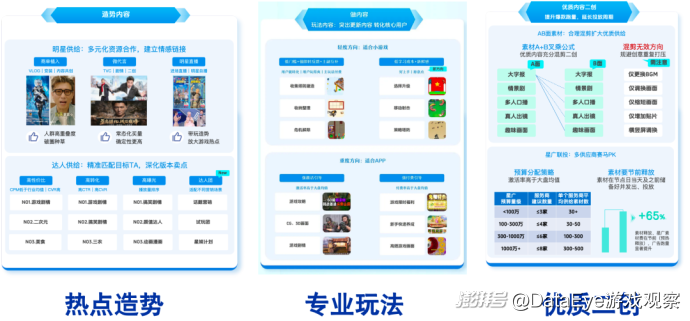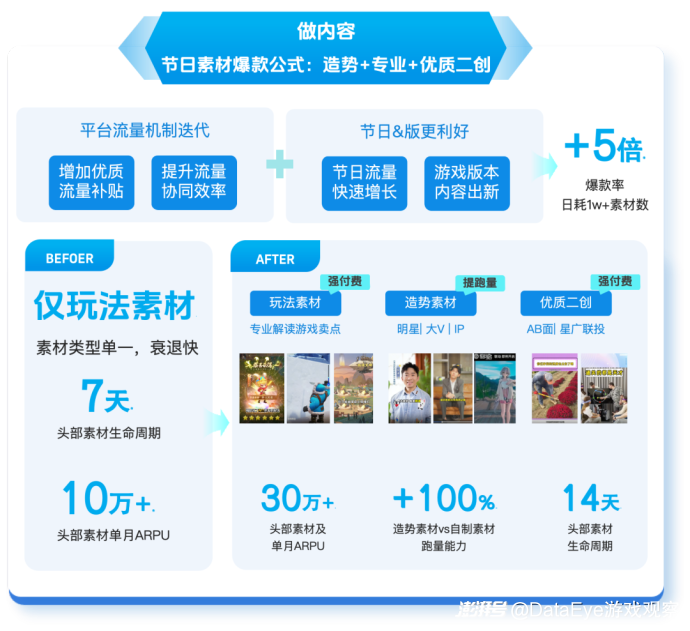 此外,抖音小游戏官方在春节档期间,还给出了节日素材爆款公式:造势+专业+优质二创——通过明星造势,可以让素材跑量能力增加100%;而专业玩法素材,则能让头部素材单月ARPU从10万+飙升至30万+;再通过优质二创内容,使得素材生命周期从7天延长至14天。
