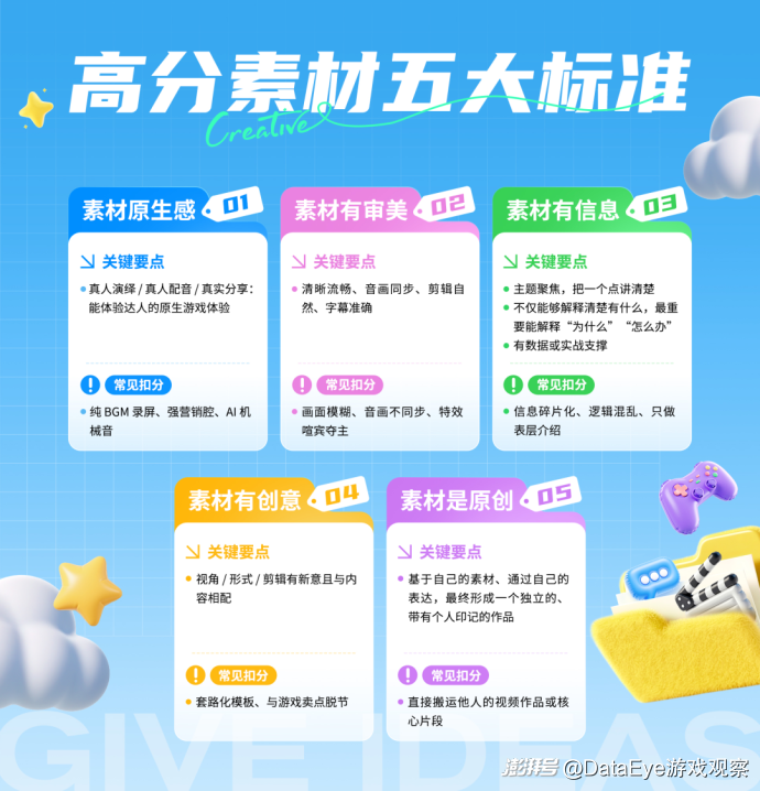 抖音小游戏列举了高分素材的五大标准“素材原生感”、“素材有审美”、“素材有信息”、“素材有创意”、“素材是原创”。同时,独有的素材起量策略,有效带动冷启速度+20%以上,让素材更充分探索。