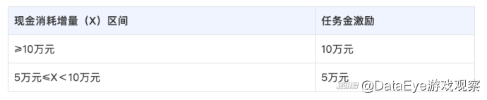 发行人消耗增长激励:基于单款小游戏在发行人场景(不含一口价)产生的月累计现金消耗,本月环比上一个自然月的现金消耗增量达成指定要求,可获得相应任务金(大于10万消耗增量可以获得10万任务金激励,大于5万小于10万的消耗增量,可获得5万任务金激励)。