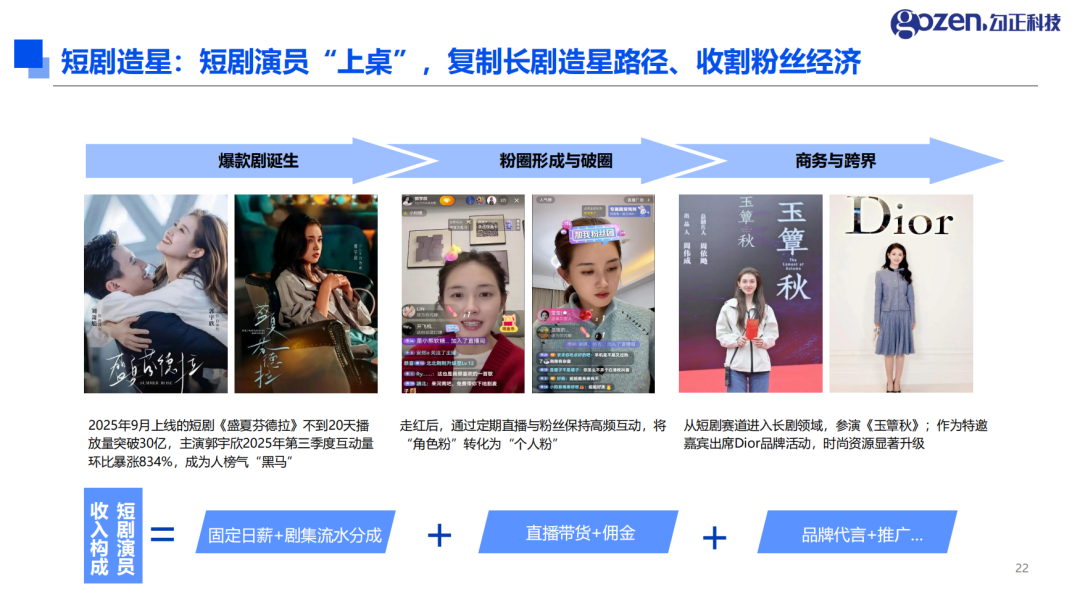 短剧已成为艺人成长的新阵地,延续长剧造星逻辑并挖掘粉丝价值。2025 年 9 月上线的《盛夏芬德拉》20 天播放量破 30 亿,主演郭宇欣互动量环比暴涨 834%,成为热门艺人。走红后的短剧演员通过定期直播将 “角色粉” 转化为 “个人粉”,进而跨界长剧、出席品牌活动,实现商务资源升级,形成 “爆款剧集 - 艺人出圈 - 商业变现” 的完整链路,艺人收入结构也日趋多元,涵盖固定日薪、流水分成、直播带货、品牌代言等。