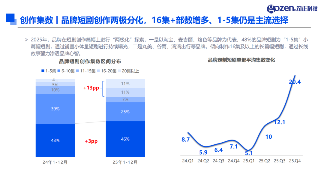 在创作集数上,品牌短剧呈现显著的 “两极分化” 趋势。一方面,1-5 集的小篇幅短剧仍是主流选择,占比达 48%,淘宝、麦吉丽、烙色等品牌通过铺量小体量内容实现持续曝光;另一方面,16 集以上的长篇幅短剧部数同比增长 13 个百分点,丸美、谷雨、滴滴出行等品牌借助长线故事深化品牌心智,品牌定制短剧单部平均集数从 2024 年的 8.7 集提升至 2025 年的 12.1 集,叙事完整性与内容深度持续增强。