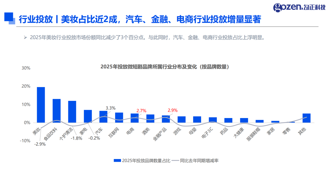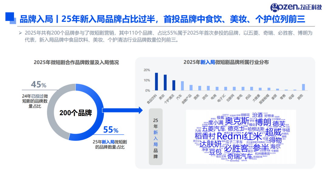 2025 年微短剧营销市场的核心关键词是 “扩容” 与 “多元”。全年共有 200 个品牌参与微短剧营销,其中 110 家为新入局者,占比达 55%,五菱、奇瑞、必胜客、博朗等品牌纷纷跨界布局。新入局品牌中,食品饮料、美妆、个护清洁行业占据前三甲,成为微短剧营销的主力军。