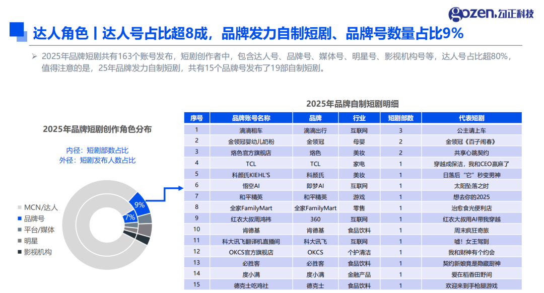 合作模式方面,定制化成为主流。2025 年在更的 297 部品牌短剧中,90% 为品牌独家合作,通过深度定制实现品牌理念与剧情的有机融合。同时,品牌合作主体呈现多元化特征,163 个合作账号中 MCN / 达人占比超 8 成,此外有 15 个品牌号自主发布 19 部自制短剧,滴滴租车、金领冠、TCL 等品牌通过自有账号搭建内容阵地,进一步强化与用户的连接。