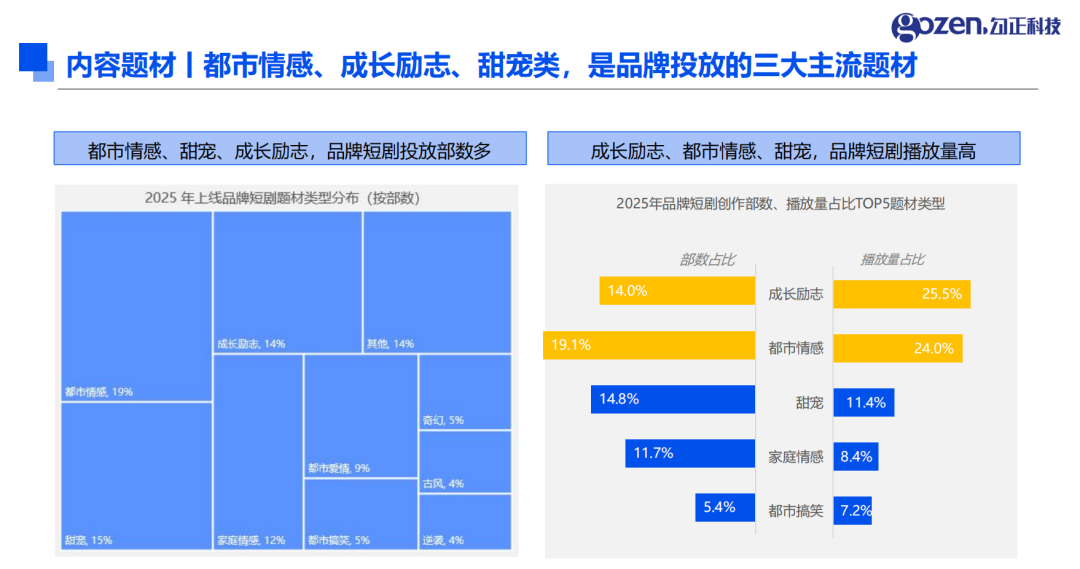 2025 年微短剧内容市场呈现 “量质齐升” 的特征。在题材选择上,都市情感、成长励志、甜宠类成为品牌投放的三大主流方向,三者不仅在投放部数上占据主导,播放量占比也名列前茅 —— 成长励志类播放量占比达 25.5%,都市情感类达 24.0%,甜宠类达 11.4%。这类题材贴近用户生活场景,容易引发情感共鸣,为品牌植入提供了良好的场景适配基础。