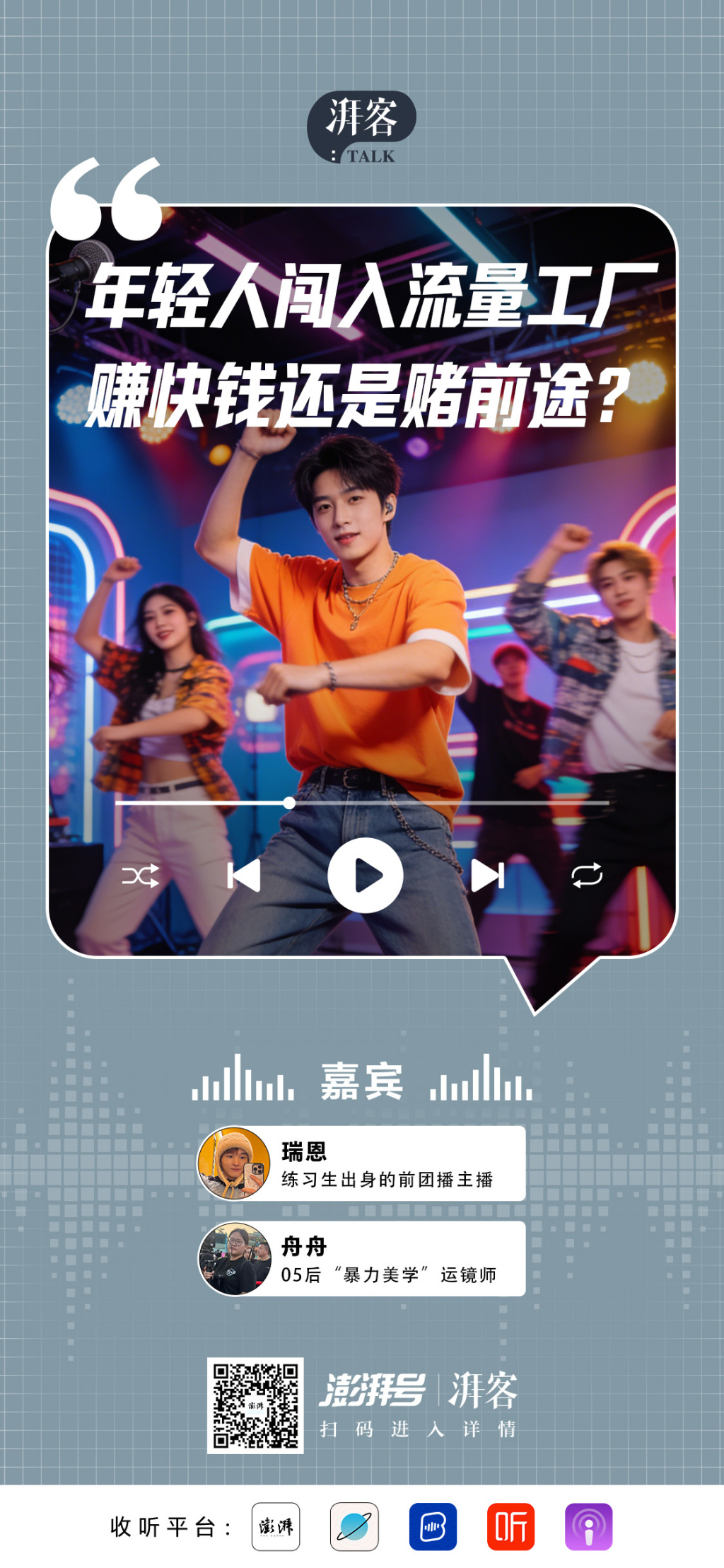 团播真的会更好吗?投身其中的年轻人,又将走向何方?本期《湃客Talk》,我们邀请团播主播瑞恩与运镜师舟舟,请他们抛开滤镜,聊聊这一行最真实的光鲜、疲惫与成长。