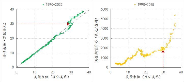 当2022年美债余额突破30万亿美元之后,美债的总市值开始趋势性低于美债余额,数据点从对角线下方移动至对角线上方,对于美债持有者而言,其手中美债的价值是缩水的,而与美债余额突破30万亿美元同步,黄金价格在突破2000美元/盎司后,进去趋势性上涨,而且上涨的斜率越来越陡,见下右图。