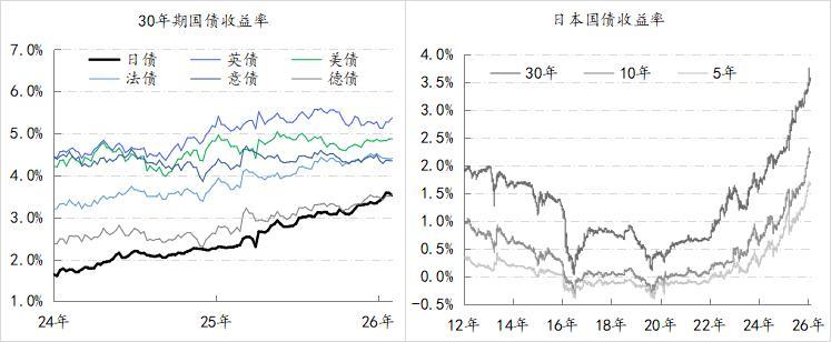 自2023年7月日本央行开启货币政策正常化进程以来,日债收益率进去趋势性上行状态,目前5年、10年和30年日债的收益率已经分别至1.7%、2.3%和3.6%,尤其是30年期日债收益率已经超过了德债水平,而且与其他发达经济体相比,日债收益率上行的幅度是最大的。除了货币政策回归正常的影响之外,目前在日债收益率趋势性上行的市场定价中,应该包含了市场对日本的通胀与财政持续性压力的担忧。