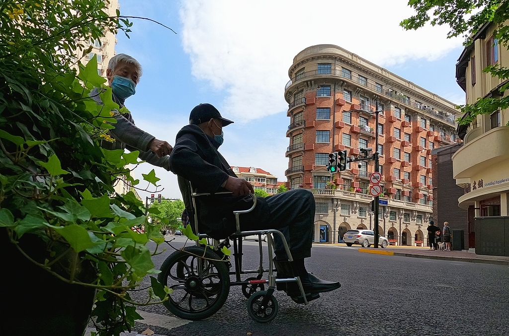 一位老人坐着轮椅路过武康大楼。视觉中国 资料图