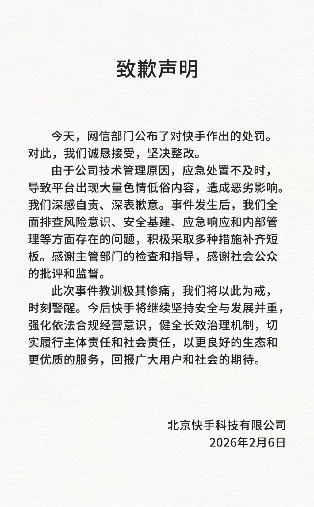 快手致歉:诚恳接受处罚,坚决整改