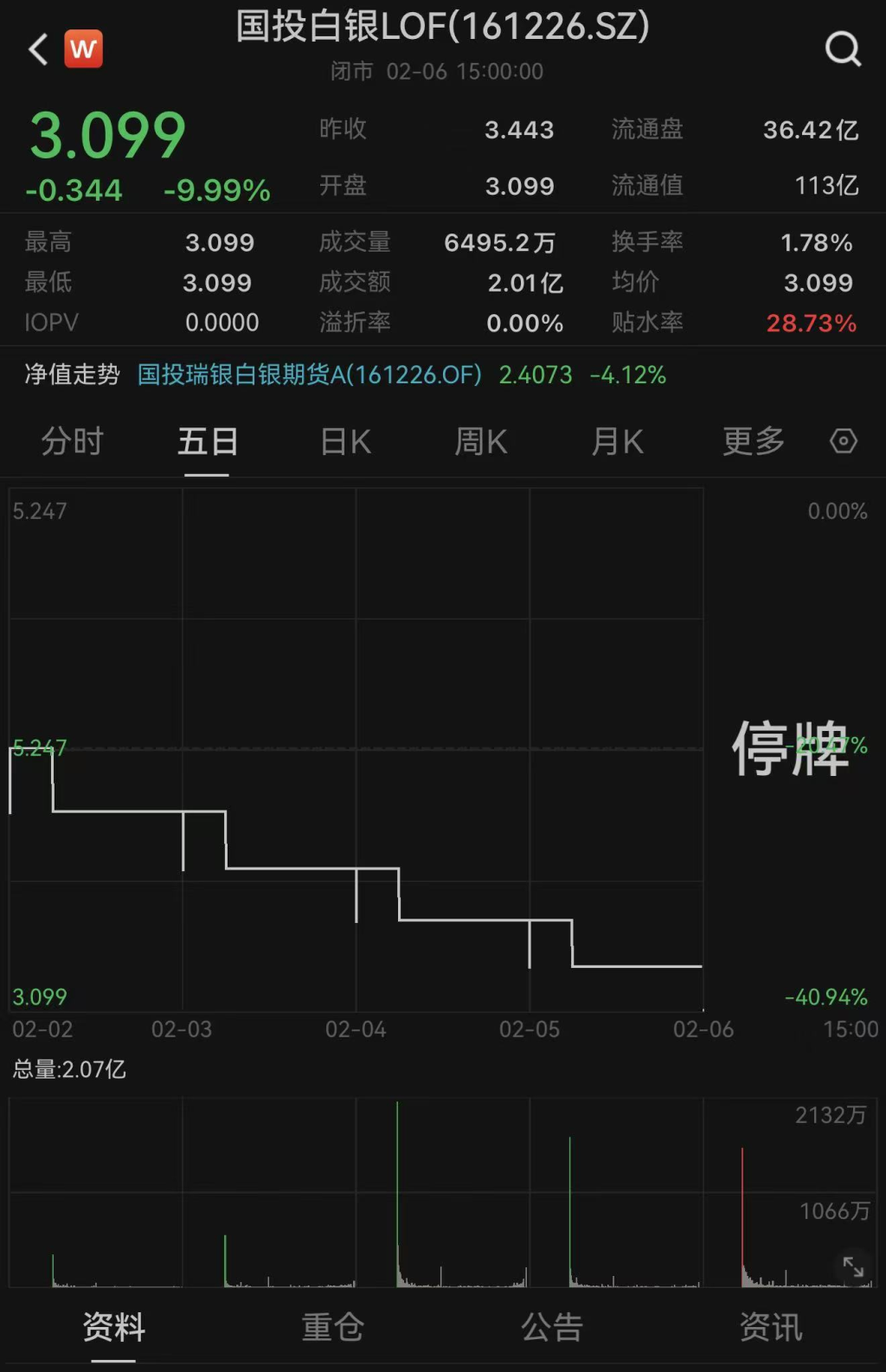 2月2日至6日,国投白银LOF场内价格已连续5个交易日“一字跌停”,单周大跌40.94%,最新价格报3.099元/份。虽然该基金场内份额连续跌停,但每天仍有0.6亿元至两亿元不等的成交额,意味着依然有资金顶着高溢价在参与交易。