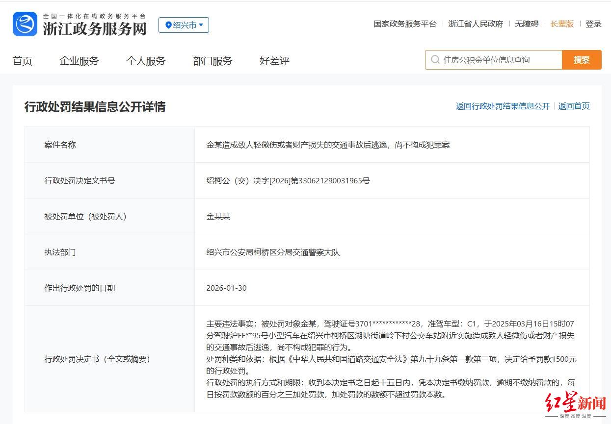 2月7日,红星新闻在浙江省政府服务网查询发现,演员金晨的行政处罚结果信息详情已经公布。详情披露了金晨主要违法事实:被处罚对象金某,驾驶证号3701************28,准驾车型:C1,于2025年03月16日15时07分驾驶沪FE**95号小型汽车在绍兴市柯桥区湖塘街道岭下村公交车站附近实施造成致人轻微伤或者财产损失的交通事故后逃逸,尚不构成犯罪的行为。