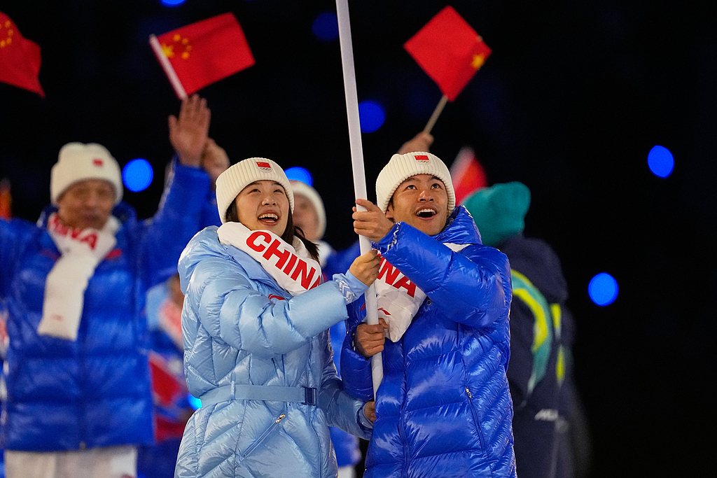当地时间2月6日,张楚桐和宁忠岩(右)作为中国代表团旗手在2026年冬奥会开幕式上入场。