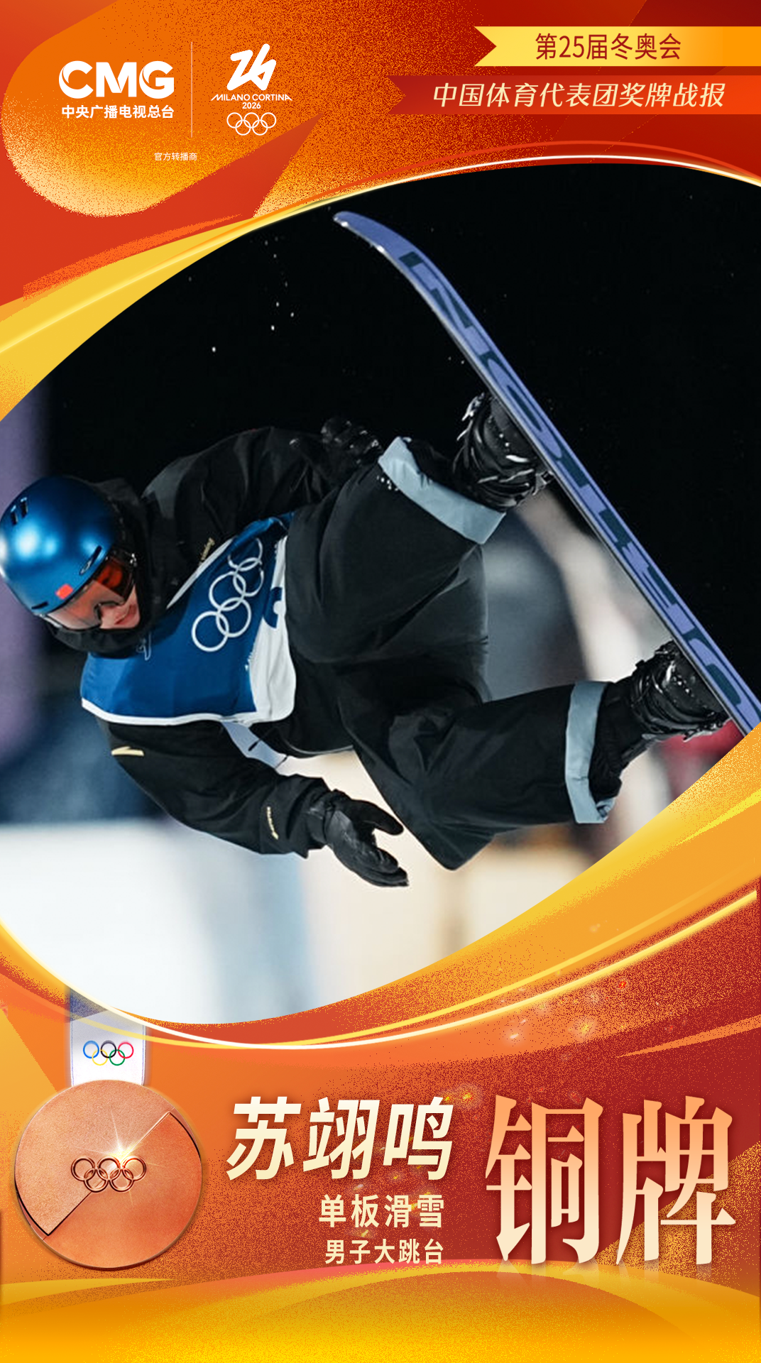 北京时间2月8日,在米兰-科尔蒂纳冬奥会单板滑雪男子大跳台决赛中,中国选手苏翊鸣获得铜牌,这是中国体育代表团在本届冬奥会获得的首枚奖牌。