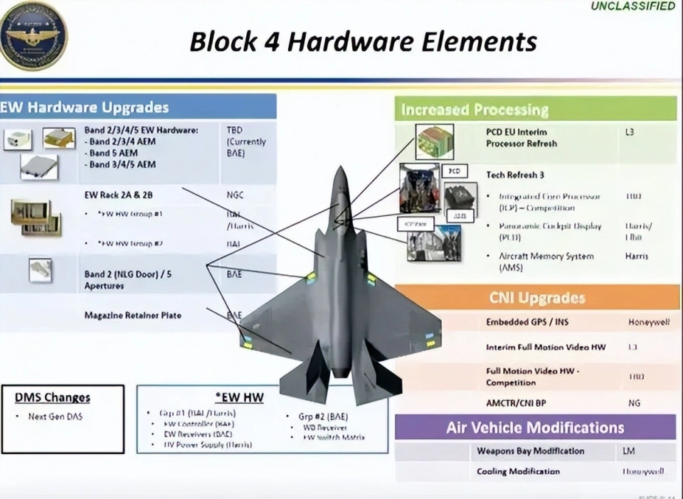 F-35战机的下一个重大新版本批次被称为F-35 Block 4,该批次预计将大幅提升飞机的武器运用能力、传感器和感知协同水平。比如采用氮化镓天线元件的新型AN/APG-85有源相控阵雷达、升级的多种传感器等组件等。这些升级被称为“技术更新3”(TR-3)的升级标准。在完整版Block 4规划中,还将升级更加强大的变循环发动机。