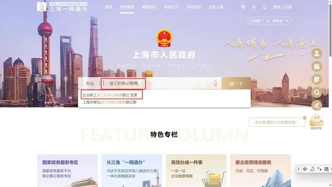 通过“上海一网通办”平台,以企业身份通过“法人一证通”或者“电子营业执照”登录后直接在搜索界面搜索“企业职工退工和停止缴费登记”,点击对应功能后的立即办理,便可到达“企业职工退工和停止缴费登记”页面。