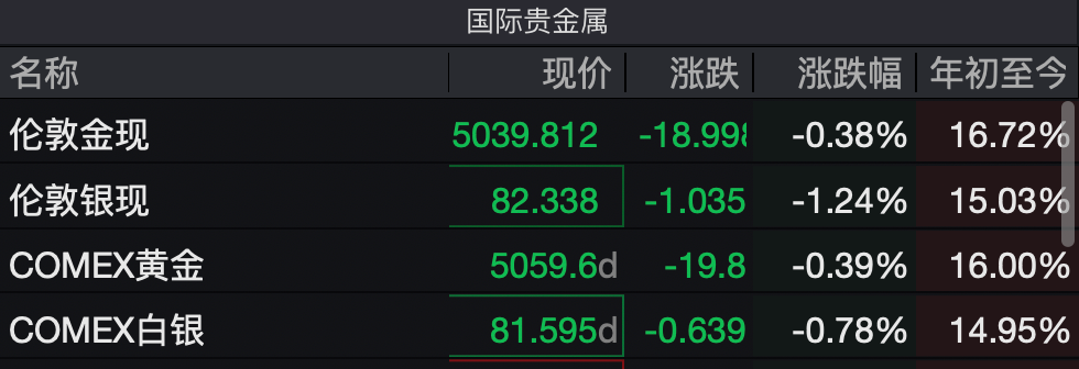 继2月9日亚市盘中突破5000美元后,当日现货黄金价格继续上涨,收盘交投于5060美元/盎司附近。不过,2月10日开盘后现货黄金再度出现回调,一度跌破5000美元,截至发稿跌0.38%,报5039.812美元/盎司;现货白银同样在大幅震荡,2月9日一度大涨8%站上83美元,截至发稿报82.338美元/盎司,跌1.24%。