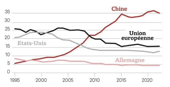 自2010年代以来,中国调整了产业政策,转向高端市场,并在高附加值领域(电动汽车、电池、机床、医药、机器人)占据一席之地。目前,中国占全球制造业产出的近三分之一,而欧盟仅占约15%,且中国制造业贸易顺差创历史新高。