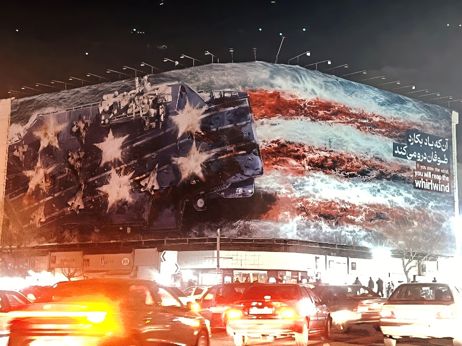 德黑兰市中心革命广场,高悬的“纵火者终将自焚”巨幅海报占据街景,画面中美国军舰被击沉于海浪之中