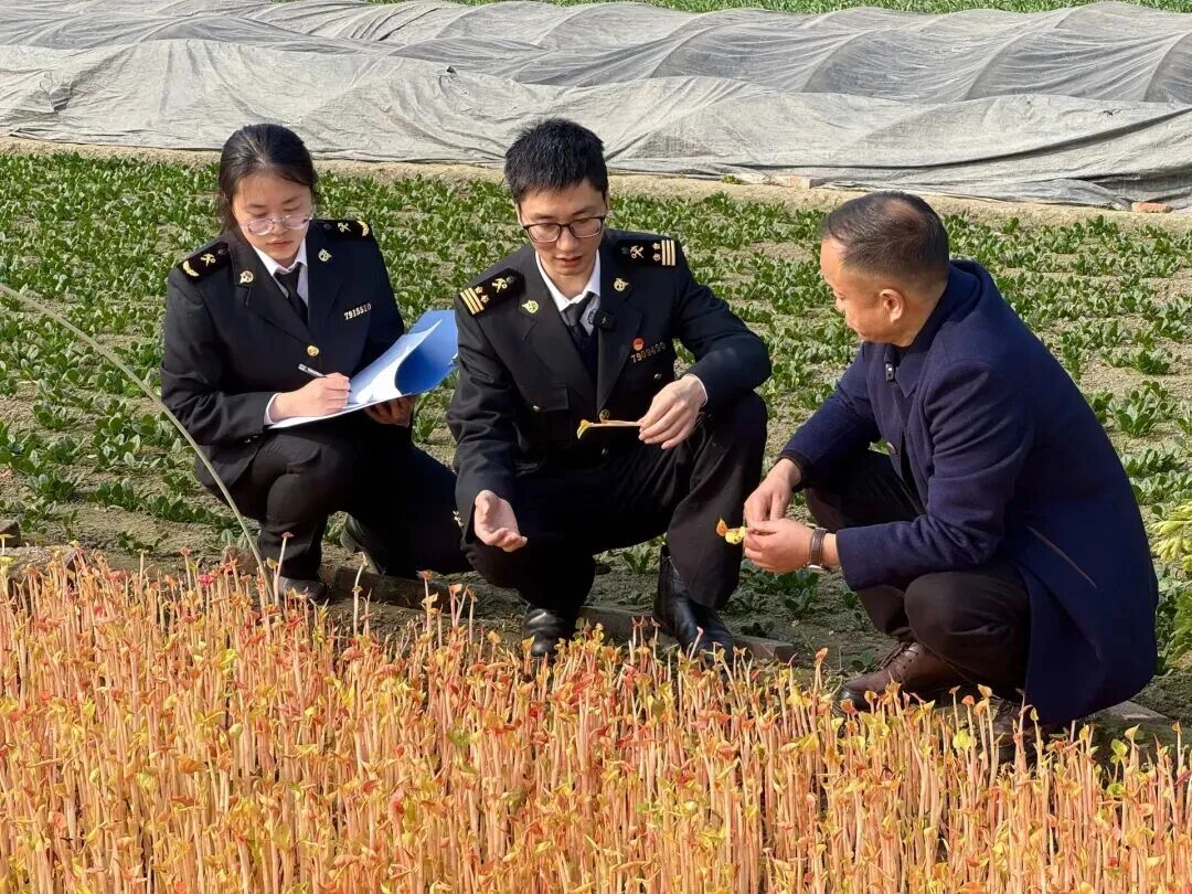 ▲海关关员现场指导出口折耳根收割