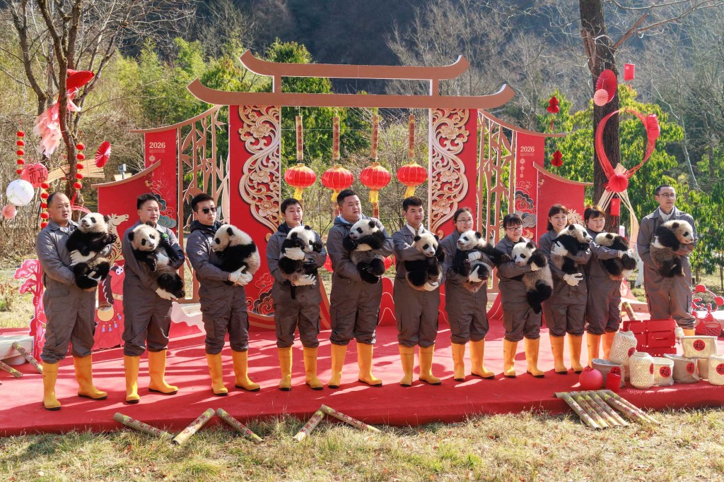 2026年2月11日,在中国大熊猫保护研究中心神树坪基地,饲养员带领2025级新生大熊猫幼崽亮相新春主题活动(2月5日摄)。新华社 图