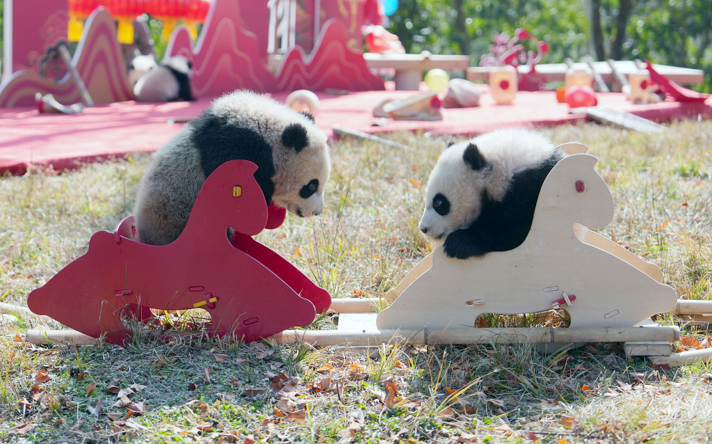 2026年2月11日,在中国大熊猫保护研究中心神树坪基地,2025级新生大熊猫幼崽在木马上玩耍(2月5日摄)。新华社 图