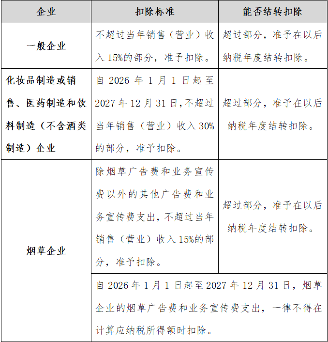 1.自2026年1月1日起至2027年12月31日,对化妆品制造或销售、医药制造和饮料制造(不含酒类制造)企业发生的广告费和业务宣传费支出,不超过当年销售(营业)收入30%的部分,准予扣除;超过部分,准予在以后纳税年度结转扣除。