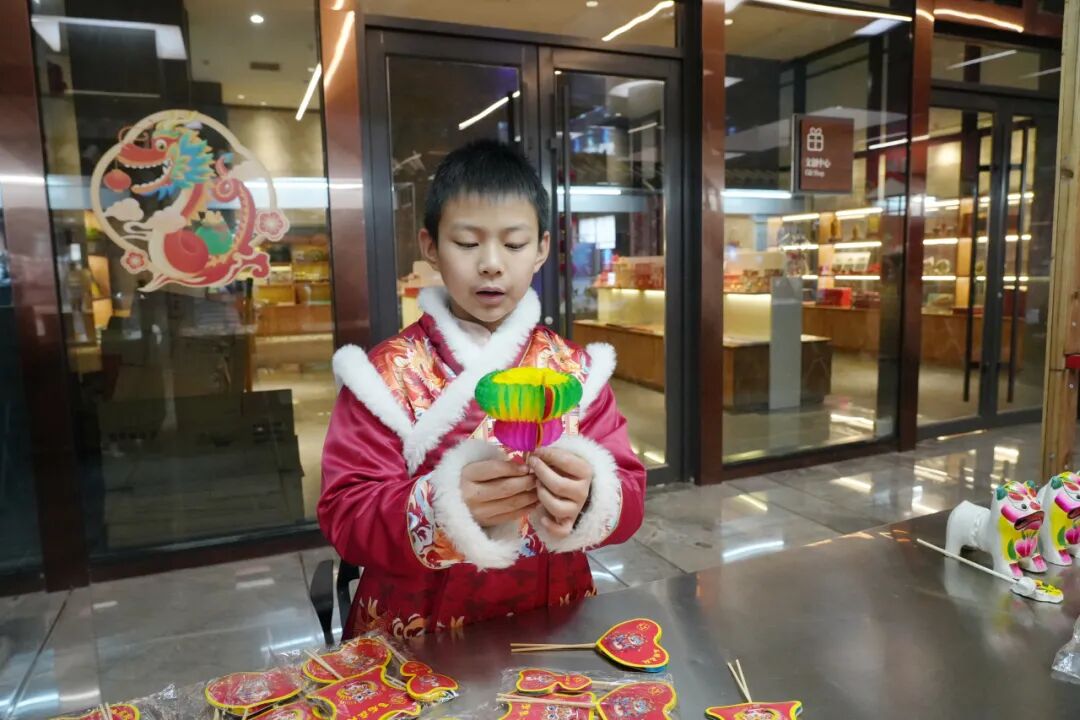 几位穿着校服的小学生,手里攥着糖葫芦,在各个摊位前穿梭。他们手里拿着刚买的小马剪纸,兴奋地说:“我觉得剪纸特别神奇,能把红纸变成小动物,我要贴在窗户上,祝大家马年快乐。”说完,手拉手又往其他摊位跑去。