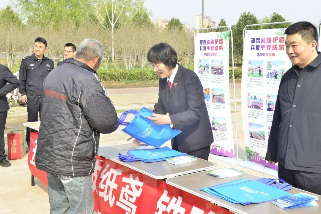 近日,石家庄铁路运输检察院检察官在滹沱河京广高铁沿线开展守护平安铁路法治宣传活动。