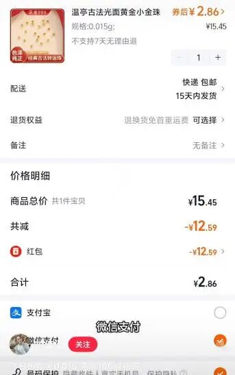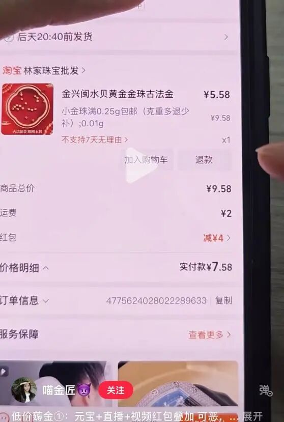 有网友表示,自己在购物平台通过叠加视频红包、蹲守直播间,可以以个位数的低价购入最少0.01克金珠。