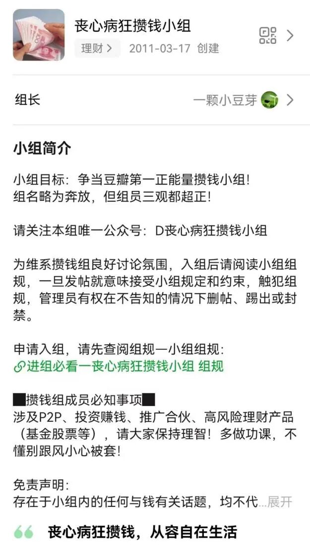 早在2011年,就有人在豆瓣建立“丧心病狂攒钱小组”,成员大多为工薪族,在小组里交流自己的攒钱心得、反消费主义的思想,从生活里开源节流,在有限的工资里攒出更多积蓄。