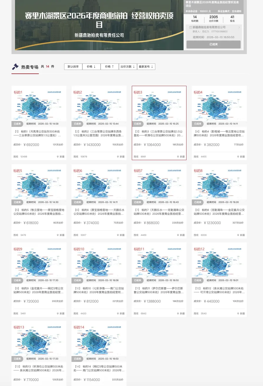 2月12日,上游新闻(报料邮箱:baoliaosy@163.com)记者在拍卖平台检索到,“赛里木湖景区2026年度商业旅拍经营权拍卖项目”已结束拍卖,共14个标的,累计出价2305次,合计成交价逾1190万元。公告显示,每个标的均为指定独立旅拍区域,景区为各标的区域提供一间约12平方米的方仓作为经营据点,中标人不得跨区域开展旅拍业务。