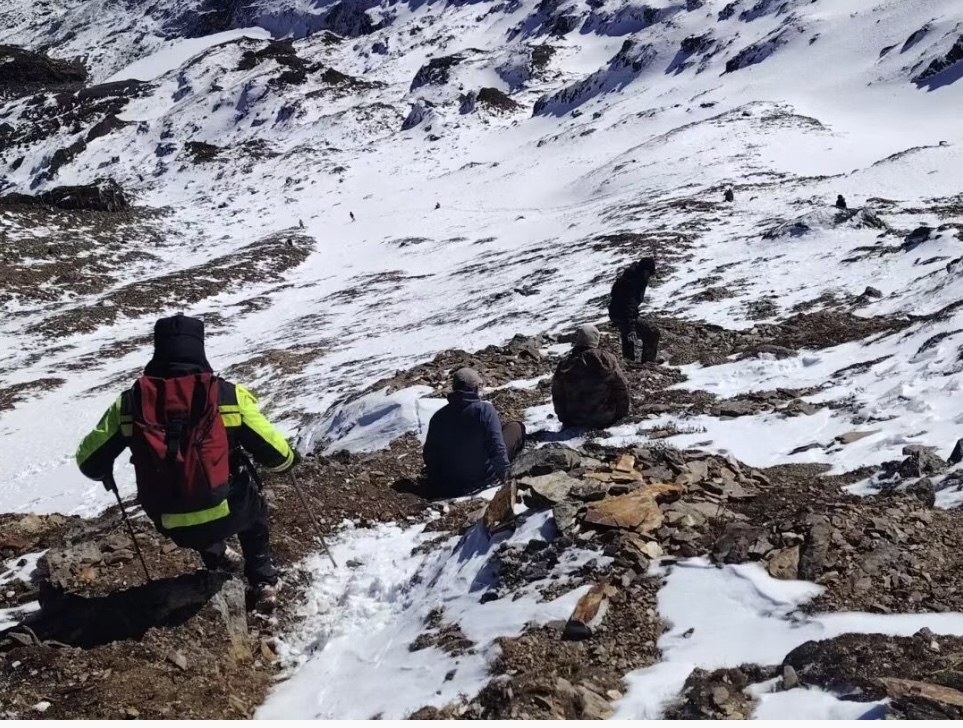 为全力搜救失联人员,再次调集公安民警、消防救援人员、乡政府工作人员、林草局扑火队员、医护人员、景区工作人员、本地熟悉地形群众等共计31人,联合组成搜救队伍,于10日18时再次进山开展全面搜救。因该区域属未开发、未开放、无管护、无救援保障的野外危险区域,山势陡峭、多悬崖碎石坡,且通信信号覆盖不全,搜救难度极大。救援人员克服缺氧、严寒、地形复杂等多重困难,采取“徒步+无人机”方式开展地毯式搜救。11日20时许最后1名失联人员被成功找到,生命体征平稳,于2月12日18时许被安全护送下山。