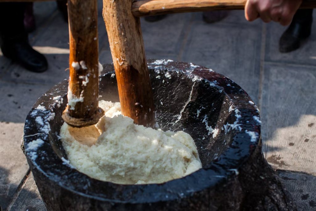 打糍粑本是男人的活计。男人们一人一杵,围着石窝转着圈,将⼒⽓捅进蒸熟的糯⽶里,糯⽶太黏,死死咬住⽊杵,需花大力气才能脱身,他们便唱起了“吭育吭育”的号子,母亲一旁笑着,见谁累了,便上前换手。待他们步调一致,让偌大一团糍粑出窝,再趁热分成小团按压,便是母亲大显身手的舞台——母亲按压糍粑,又快又圆。