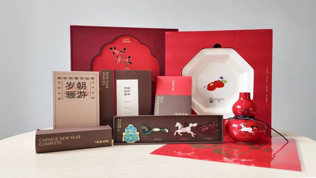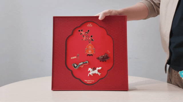 礼盒通体正红,中间像一幅镶边画轴,“岁朝骊游”的主题直接把文化氛围拉满。这一主题的灵感来自古人岁首悬挂的《缂丝岁朝图》,讲究的是花果并陈、吉祥满案。开盒如入画,新年开场的仪式感一下子就来了~