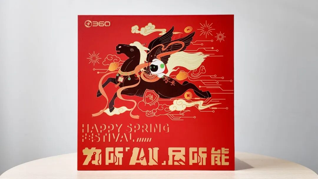 大红礼盒封面是一匹振翅奔腾的黑马,搭配电路纹样与烟火元素,下方写着“知所AI,尽所能”,科技与传统图腾融合在一起,视觉上依然是360熟悉的硬核气质。