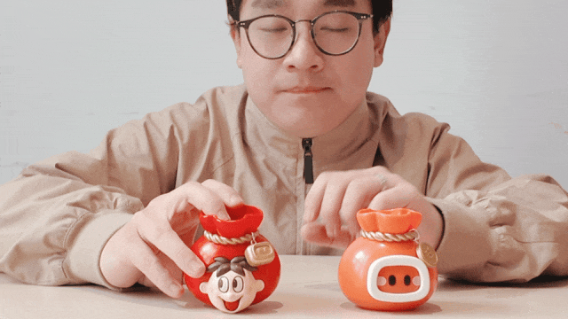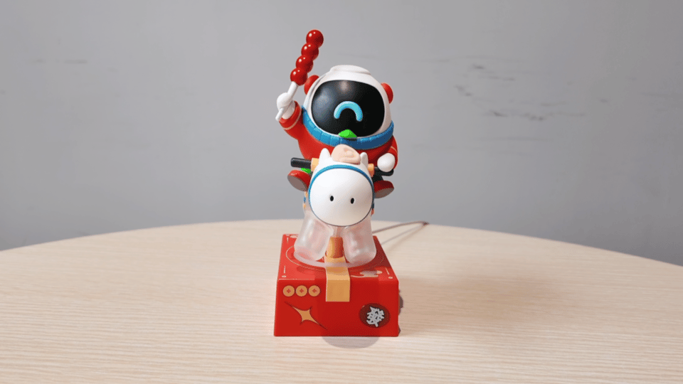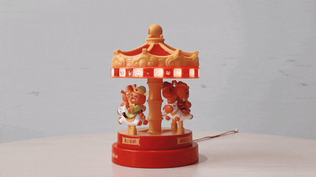菜小鸟戴着红围巾,稳稳坐在白色摇摇马上,手里举着一根糖葫芦。用这根糖葫芦触碰公仔底座,摇摇马就会开始摆动。继续触碰还能切换“恭喜发财”、“步步高升”等年味BGM,可玩性吊打一众常规礼盒。