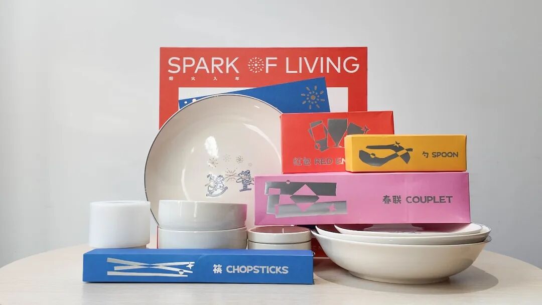 打开礼盒,内部物品分成了三层,核心是一套高温瓷的定制餐具,此外还有HBK呼吸灯、鸡翅木筷子,以及春联和新年红包。