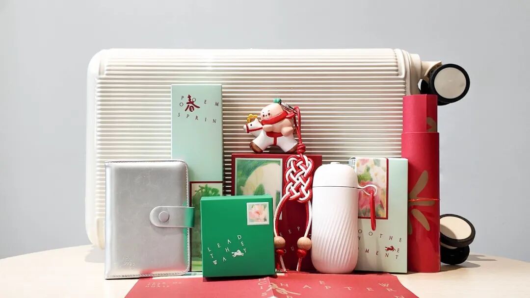 小红书今年的新春礼盒,关键词两个字——出发。整套礼盒以旅行作为主线,核心是一只定制登机行李箱,红、黑、白三色随机。箱体设计干净利落,自带“随时出发”的氛围感。它不像传统节日礼盒那样强调热闹,而是把新年的第一步放在远方。