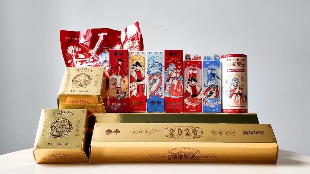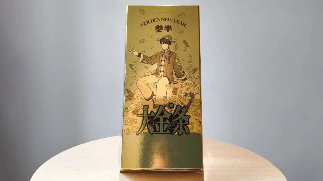 如果要评选今年的最壕礼盒,参半绝对凭实力断层出道!今年参半联名了《非人哉》漫画,把整份礼盒做成了一块巨型“大金条”,拉满了新年的富贵气。这款大金条礼盒的光泽感十足,正面印着《非人哉》中掌管世间财源的“武财神”赵公明,也是把新春暴富的寓意焊死在了包装上。