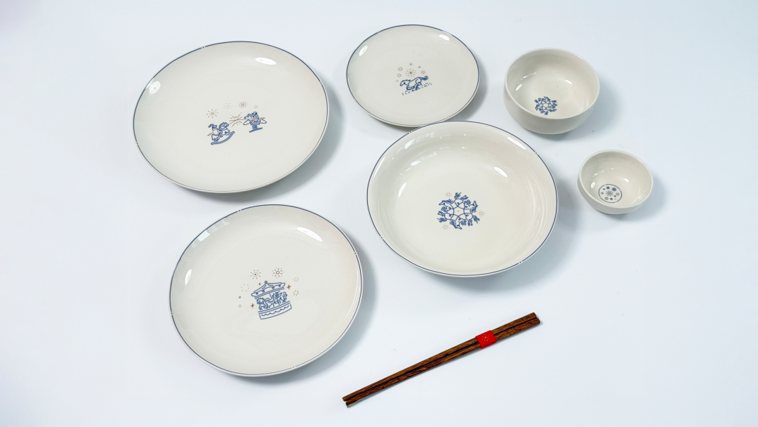 这整一套餐具是礼盒的重点,奶白的底色搭配深蓝色的描边,给人的感觉温润、舒适、有气质。以及最能凸显出设计感的是,盘面中央印着不同形态的马的符号形象:旋转木马、弹簧木马、摇摇马……实在是说不出的生动可爱。