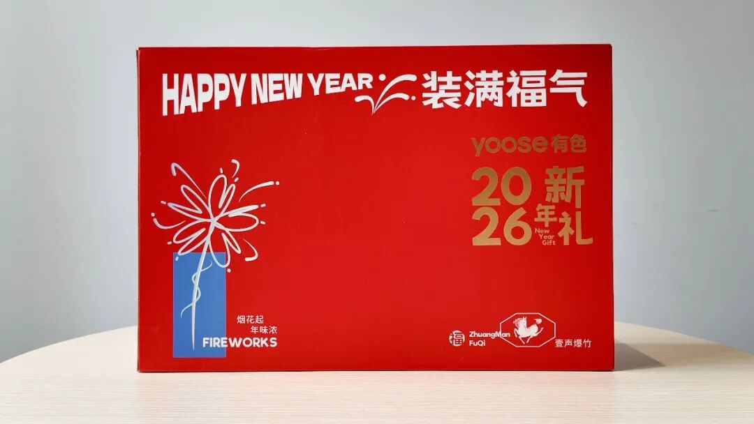 有色yoose今年的新春礼盒设计得活泼感十足,包装上的烟花元素和“FIREWORKS”字样——这气氛感,不用拆都知道是冲着热闹来的。过年,当然要像爆竹一样响亮啦~