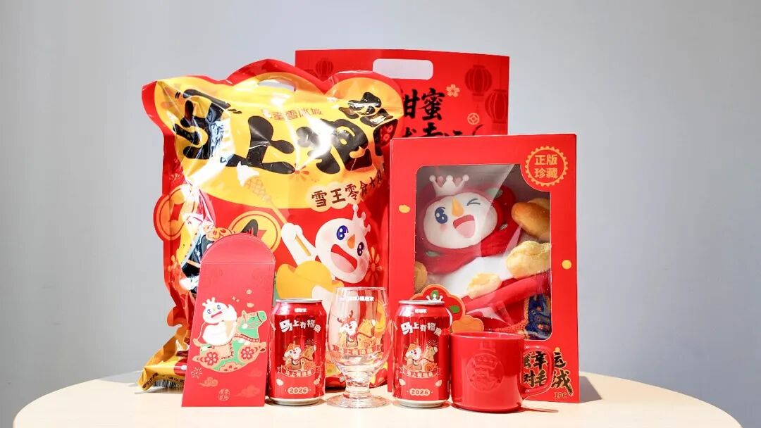 打开礼盒,里面的每一件物品都藏着雪王式的可爱与实在:“马上抱富”雪王零食大礼包、福鹿家啤酒和配套酒杯、巨大一个的不倒翁雪王毛绒玩偶。雪王戴着小皇冠,怀里抱着金元宝,坐在红色底座上憨态可掬,新年“抱富”的好彩头,就这么稳稳地立在了桌上。
