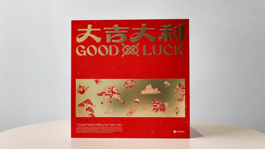 京东主打一个“大吉大利”,新春礼盒红金配色大气端庄,烫金的“大吉大利 GOOD LUCK”占据视觉中心,好运似乎都要呼之欲出了。下方是带有马年元素的插画图景——奔马、瑞兽、祥云、松柏……气势铺满整个画面。