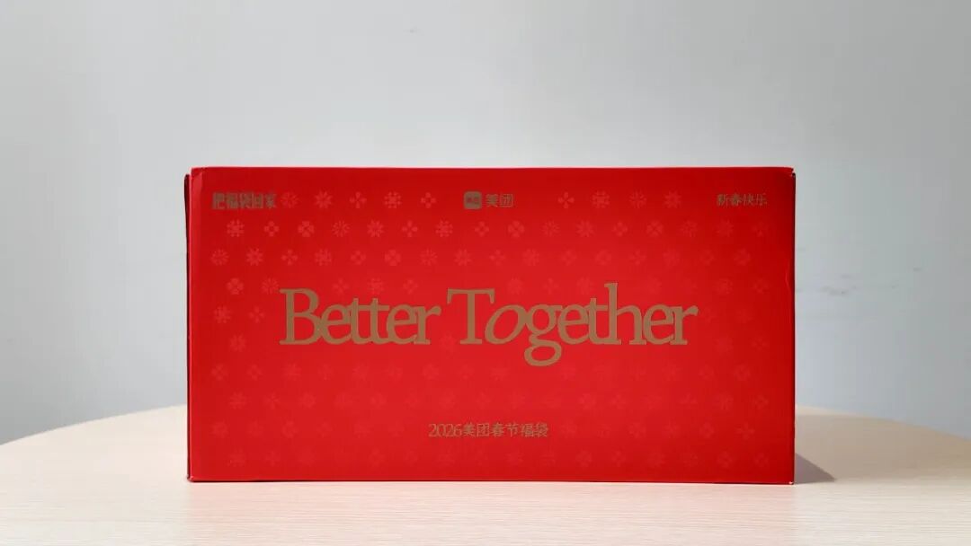 美团今年的新春礼盒,延续了熟悉的主题——“把福‘袋’回家”。整体围绕“美好团圆”展开,配置上依然走的是实用主义路线:零食大礼包、春联红包组合、团团毛绒盲盒,以及一条暖心毛毯。