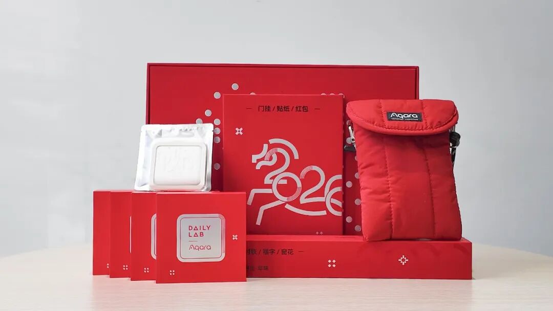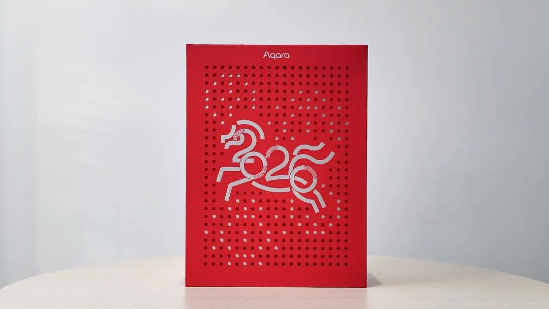 Aqara的新春礼盒是简约又不失设计感的风格,外包装纯正的中国红,采用穿孔工艺,中间用银色线条将2026与马的轮廓巧妙融合。