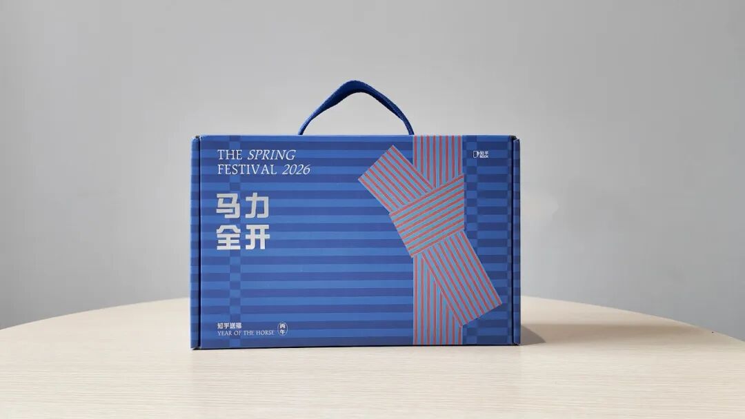在一众红红火火的礼盒里,知乎的新春礼盒显得格外亮眼。整体采用蓝色为主色调,横向条纹铺陈开来,银色的四个大字——“马力全开”,像是提前给新的一年按下了加速键。