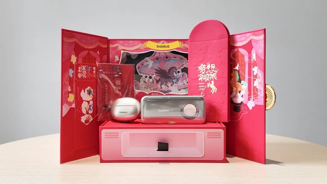 整个礼盒围绕“乐园补给”展开。核心配置包括倍思灵动充伸缩线快充移动电源与MC1 Pro AI耳夹耳机。前者强调“能量满格,收放自如”,伸缩线设计本身就带着节奏感,像是为奔赴梦想随时充电;后者则以轻量佩戴与沉浸音质,为灵感和节奏开“挂”。从出行到通勤,从创作到日常,科技产品成为追梦路上的装备。