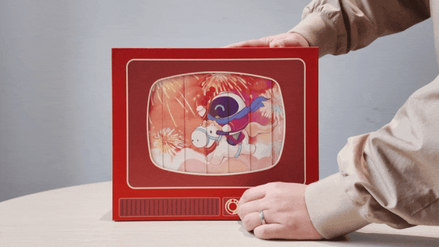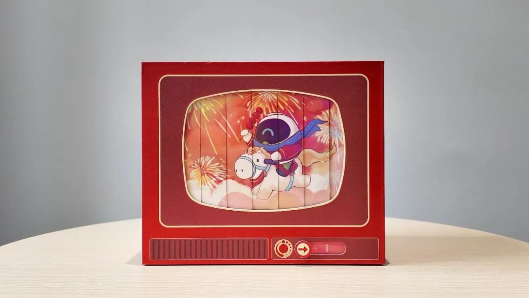 菜鸟裹裹2026年的新春礼盒做成了一台复古电视机,通体是喜庆的正红色,带有屏幕边框和按键区,细节感十足。最妙的是它真的能手动“切换频道”:滑动下方的电视旋钮,屏幕里的画面会跟着变换。